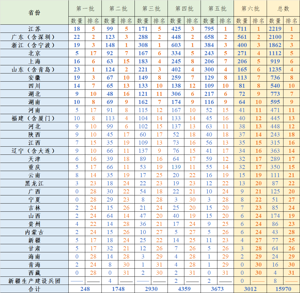 1. 前六批小巨人數量及排名