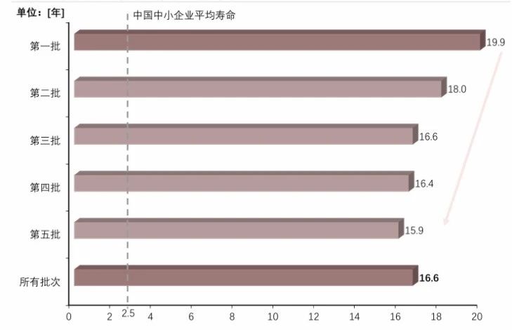 專精特新“小巨人”企業(yè)平均成立年限為16.6年,遠(yuǎn)超中國中小企業(yè)平均壽命2.5年,這表明企業(yè)需經(jīng)過長時(shí)間專業(yè)能力積累和沉淀,憑借過硬的技術(shù)、產(chǎn)品及抗風(fēng)險(xiǎn)能力,才能進(jìn)入穩(wěn)定發(fā)展階段。從各批次來看,2019—2023年五批次企業(yè)平均壽命呈遞減趨勢,反映出經(jīng)濟(jì)發(fā)展、企業(yè)擴(kuò)張和政策支持使專精特新“小巨人”企業(yè)成長周期縮短,未來有望實(shí)現(xiàn)更快成長。