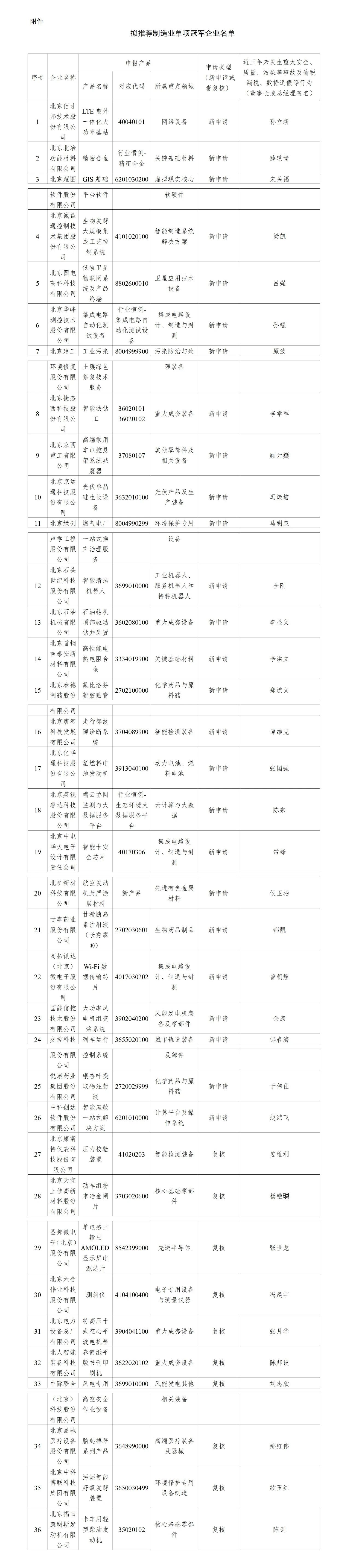 根據(jù)《工業(yè)和信息化部辦公廳關(guān)于開(kāi)展2024年制造業(yè)單項(xiàng)冠軍企業(yè)遴選認(rèn)定和復(fù)核評(píng)價(jià)工作的通知》(工信廳政法函〔2024〕328號(hào)),北京市經(jīng)濟(jì)和信息化局組織開(kāi)展了2024年國(guó)家制造業(yè)單項(xiàng)冠軍企業(yè)遴選認(rèn)定和復(fù)核評(píng)價(jià)推薦工作,已按規(guī)定程序完成相關(guān)審核、公示及上報(bào)。現(xiàn)根據(jù)工信部相關(guān)工作部署,按照公示模板再次公示(詳見(jiàn)附件)。
