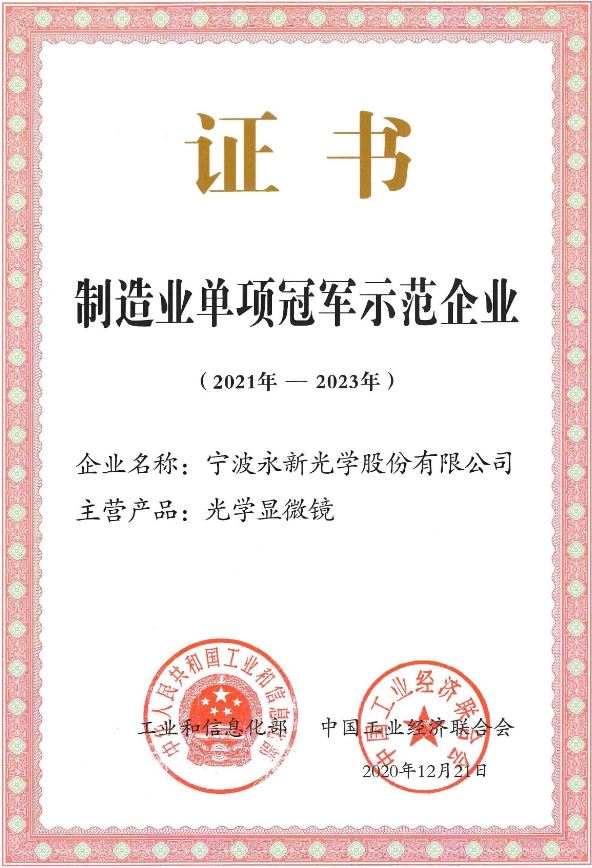 公司于2017年參與國家第二批制造業單項冠軍企業評選,并憑借產品——光學顯微鏡,成功入選第二批國家制造業單項冠軍培育企業。按照國家工信部要求,本次成功通過復評升級為國家級制造業“單項冠軍示范企業”,這既是國家與市場對永新光學產品的肯定,也是永新光學自身實力強有力的證明,有助于更好激發公司不斷開拓創新,積極研發新產品。