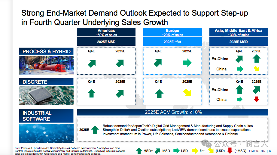 (注:Process & Hybrid includes Control Systems & Software, Measurement & Analytical and FinalControl. Discrete includes Test & Measurement and Discrete Automation. Underlying industrial software sales are embedded within regional and end-market performances and outlooks.