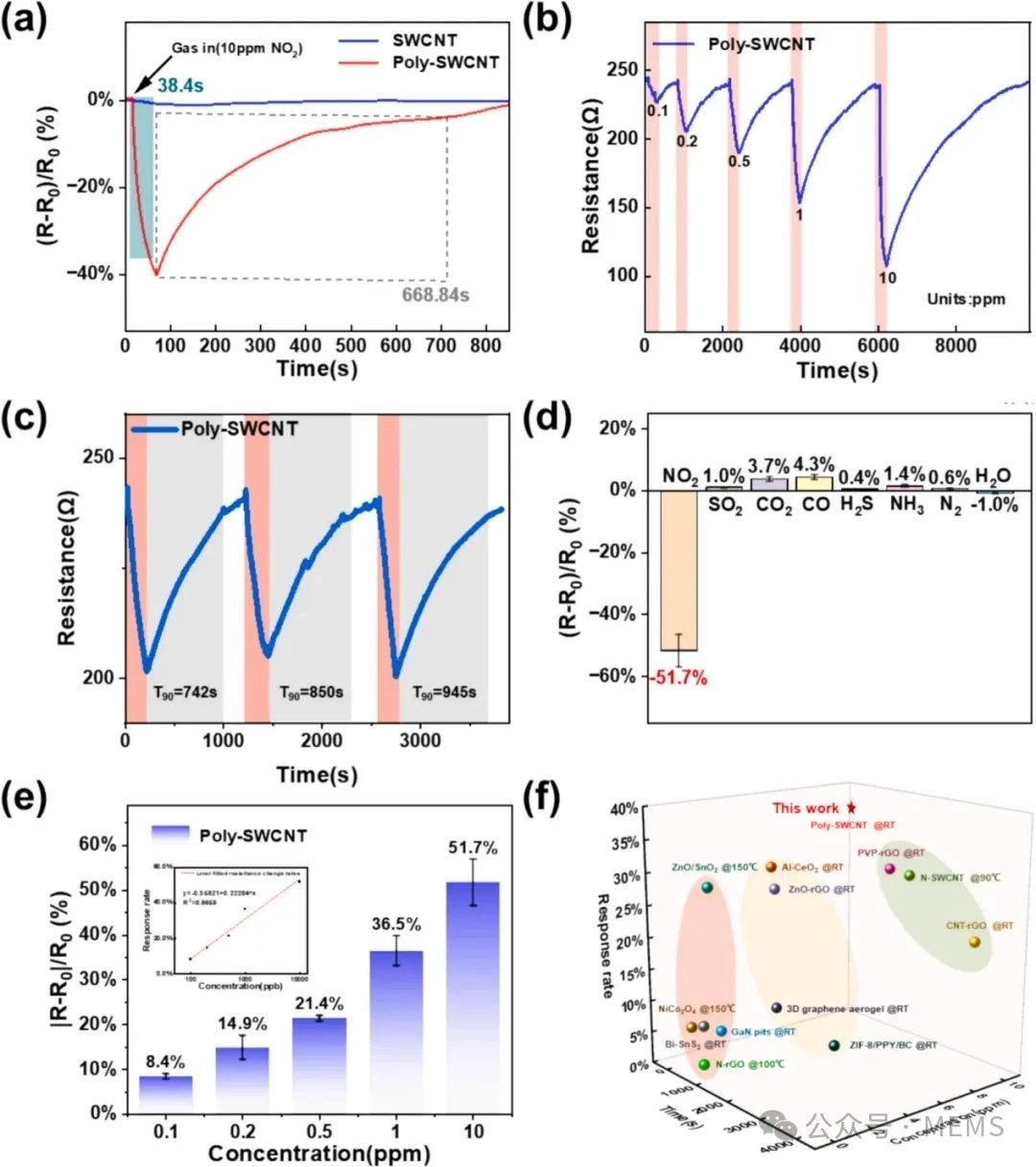 近日,中國科學院上海微系統所程建功團隊成功研發出一種高特異性、室溫工作的NO2傳感器。該氣體傳感器依托一種新型交替共軛聚合物,與碳納米管自適應纏繞為剛柔并濟的骨架結構,形成特異性鹵鍵側鏈協同作用位點,實現對NO2分子的精準捕獲與感知。室溫下檢測下限達到1.8 ppb,并具有優異的選擇性和環境穩定性,適用于智能建筑、工業廠房、環境監測站等多場景NO2氣體檢測。