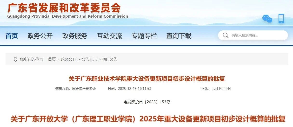 12月15日,廣東省發(fā)展和改革委員會(huì)連續(xù)發(fā)布兩項(xiàng)批復(fù)——“關(guān)于廣東職業(yè)技術(shù)學(xué)院重大設(shè)備更新項(xiàng)目初步設(shè)計(jì)概算的批復(fù)”以及“關(guān)于廣東開放大學(xué)(廣東理工職業(yè)學(xué)院)2025年重大設(shè)備更新項(xiàng)目初步設(shè)計(jì)概算的批復(fù)”。根據(jù)批復(fù),兩所院校擬更新購置共142臺(tái)(套)教學(xué)科研儀器設(shè)備,總投資14930萬元。